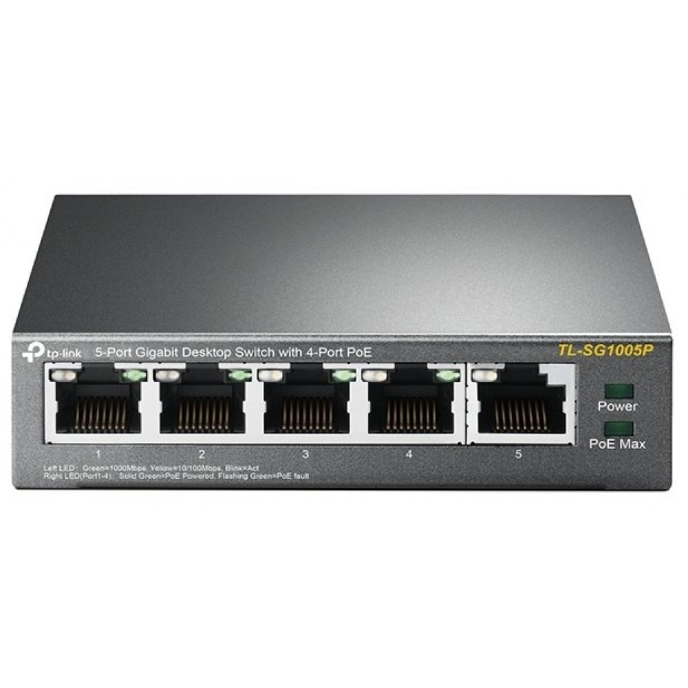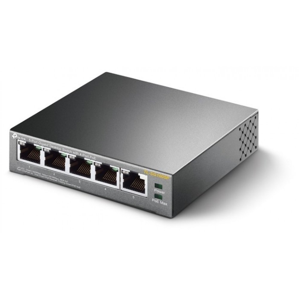 5-Port Gigabit Desktop Switch with 4-Port PoE, 5 Gigabit RJ45 ports including 4 PoE ports, 56W PoE Power supply, steel case