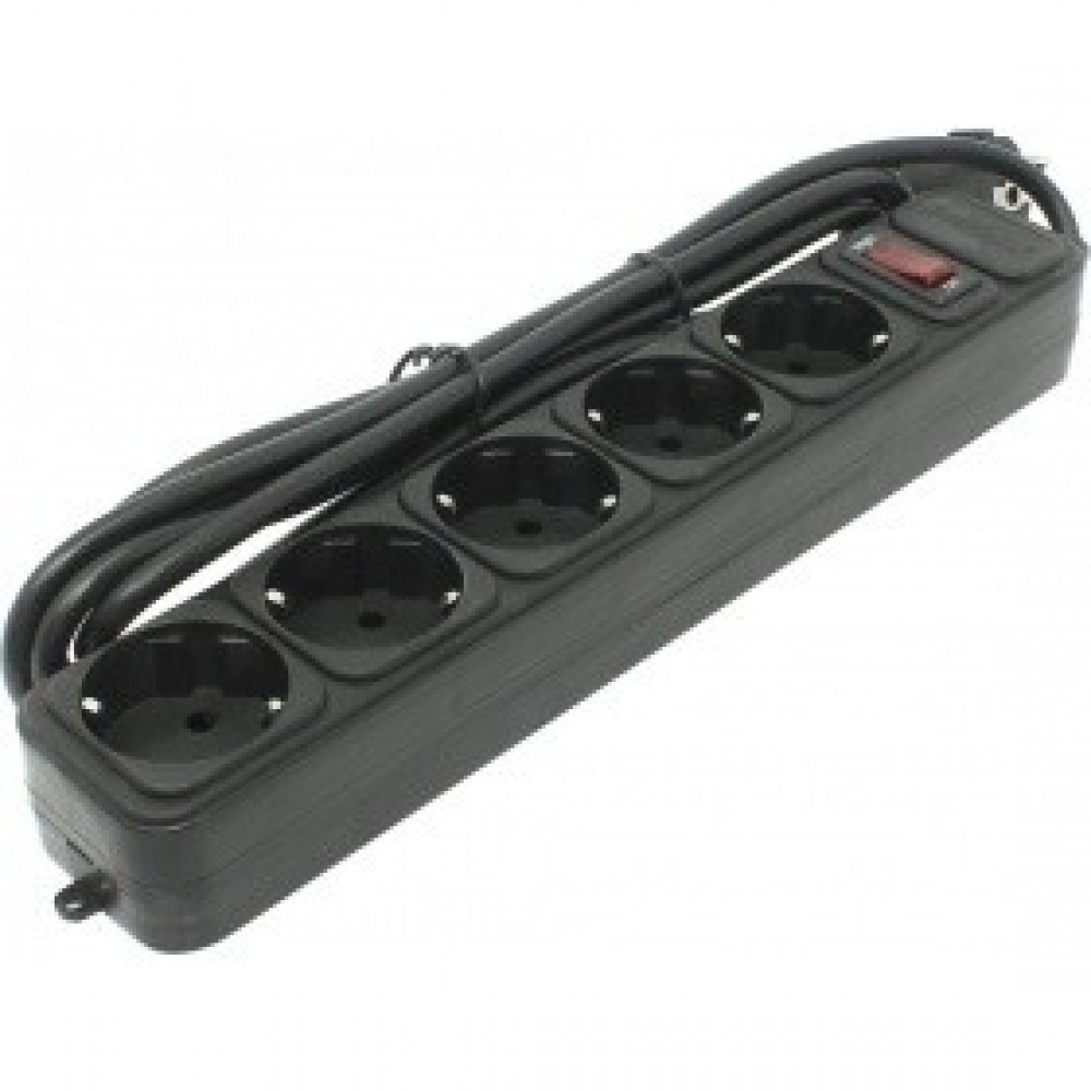 сетевой фильтр на 5 евророзеток, суммарная мощность нагрузки: 2.2 кВт, максимальный ток нагрузки: 10A, кабель 3м, чёрный