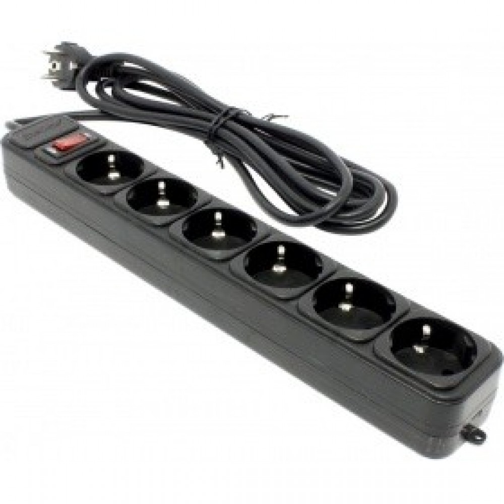 сетевой фильтр на 6 евророзеток, суммарная мощность нагрузки: 2.2 кВт, максимальный ток нагрузки: 10A, кабель 3м, чёрный