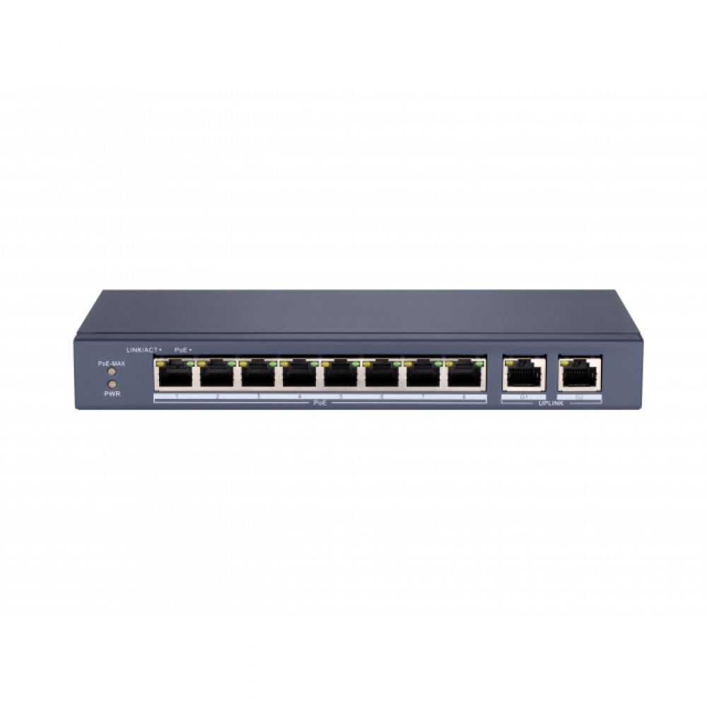 DS-S1008P Сетевой неуправляемый коммутатор 8 RJ45 100M PoE, 2 порта с высоким приоритетом 2 Uplink порта Gigabit IEEE802.3af, IEEE802.3at бюджет PoE 60Вт поддержка режима передачи до 250м,10Мбит/с (1-8 порт), CAT5e защита от перенапряжений, DC48В, 1.35A 65Вт -10 °C...+40°C.